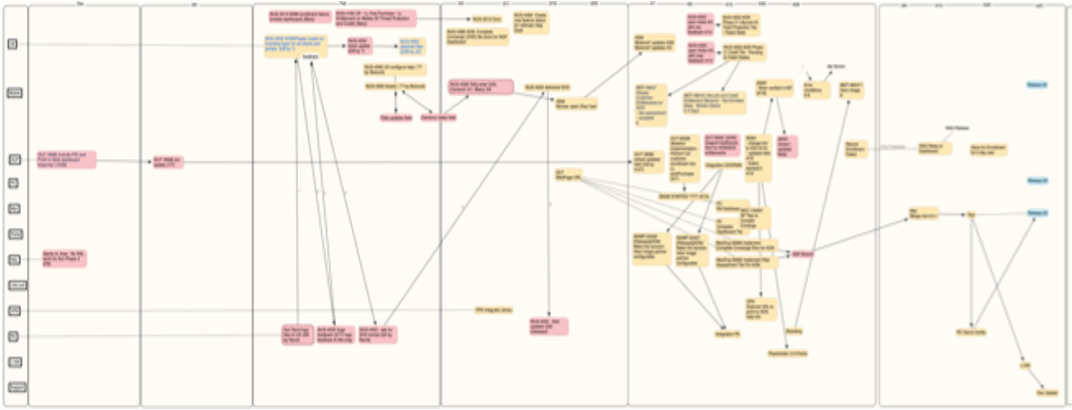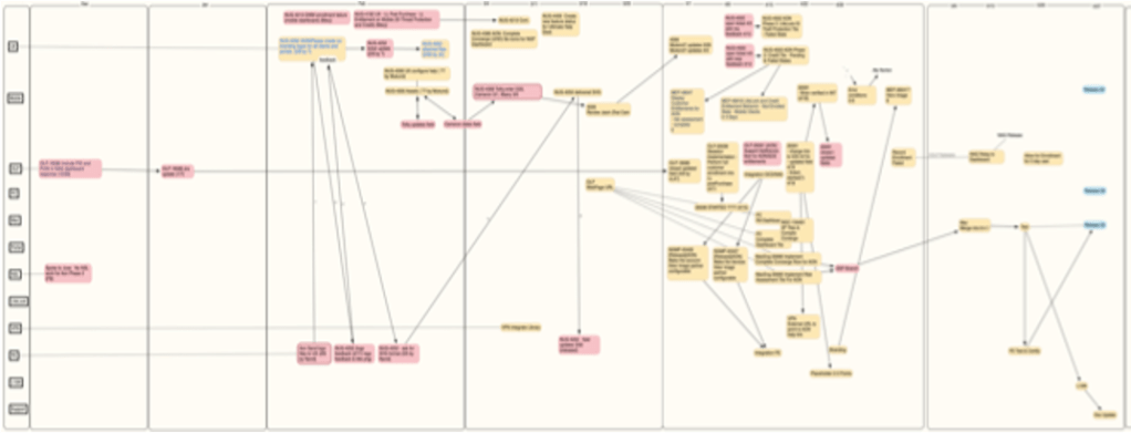 I was a transformation coach at a large software company that was struggling with exactly this issue. Minor customer requests or enhancements seemed to take forever to deliver. So I worked with a colleague to do a deep dive into the problem. We selected a simple feature enhancement that took twelve weeks to deliver once the work began and inspected every Jira ticket that related to it. The following graphic shows the dependencies between all of the teams that were involved in the solution. It is blurred intentionally of course.