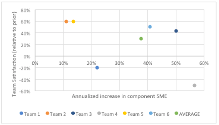 Average team satisfaction increased by 30% over a period of six months, mostly because developers got out of their rut and learned new things. Subject matter expertise improved by 38% on an annualized basis.